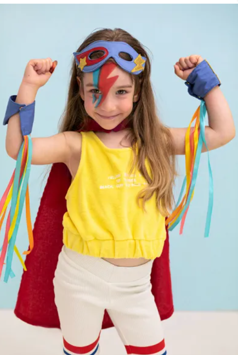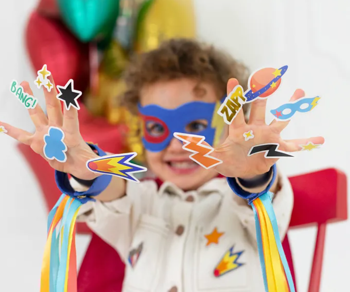 Mala com fantasia de super-herói, o conjunto contém capa, máscara e punhos de super-herói, stickers, acessórios para sapatos e alfinetes.
