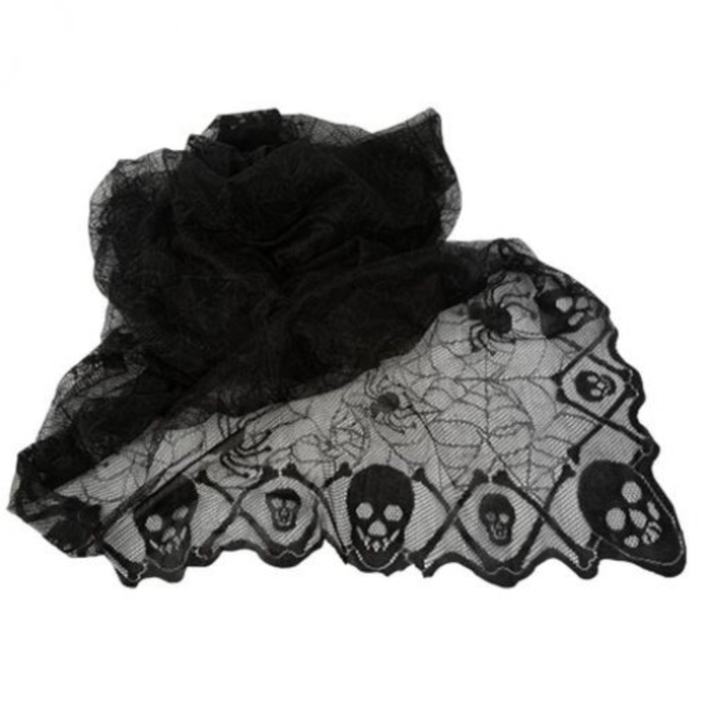 Toalha de mesa em renda preta com estampa de aranhas e caveiras, com a medida de 1,82 x 1,37cm.
