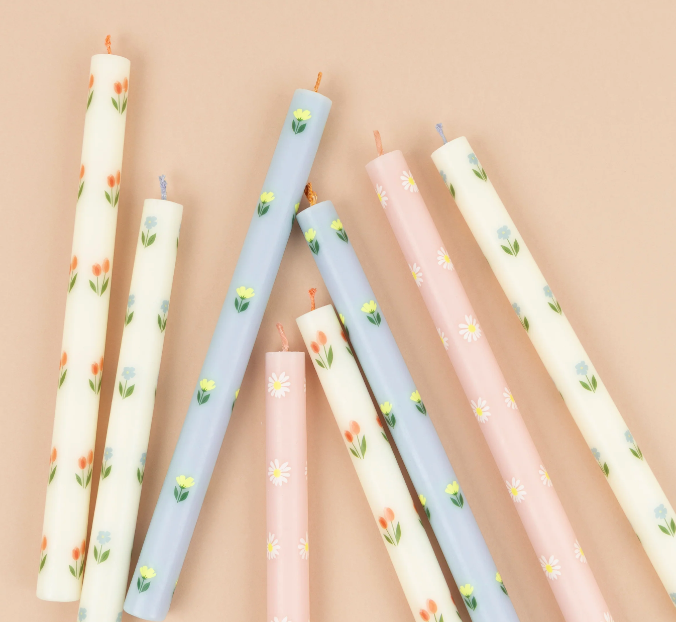 Conjunto de 8 velas de mesa com estampados florais, sem perfume. Ardem cerca de 7 horas.
