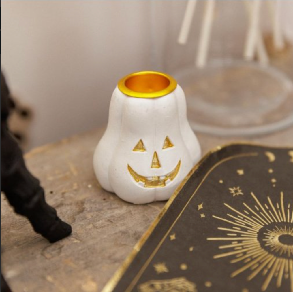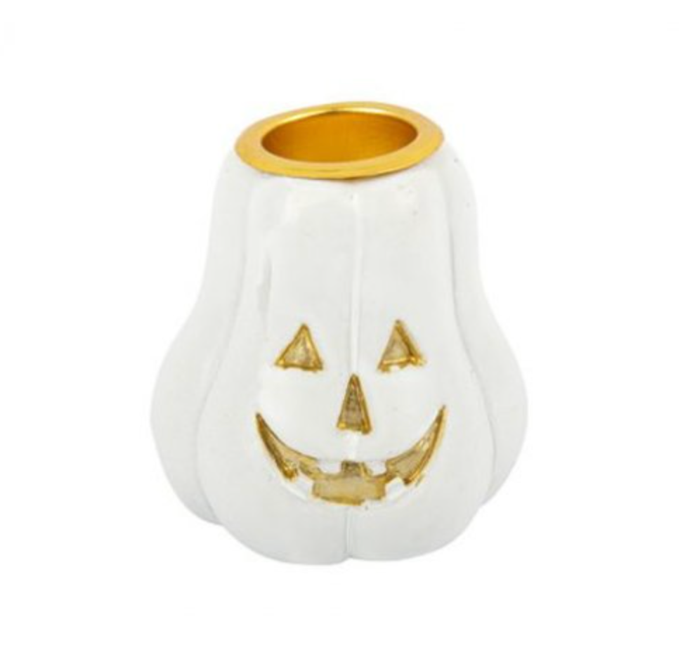 Castiçal em forma de abóbora, em resina, com a medida de 5,5 x 5,5cm.