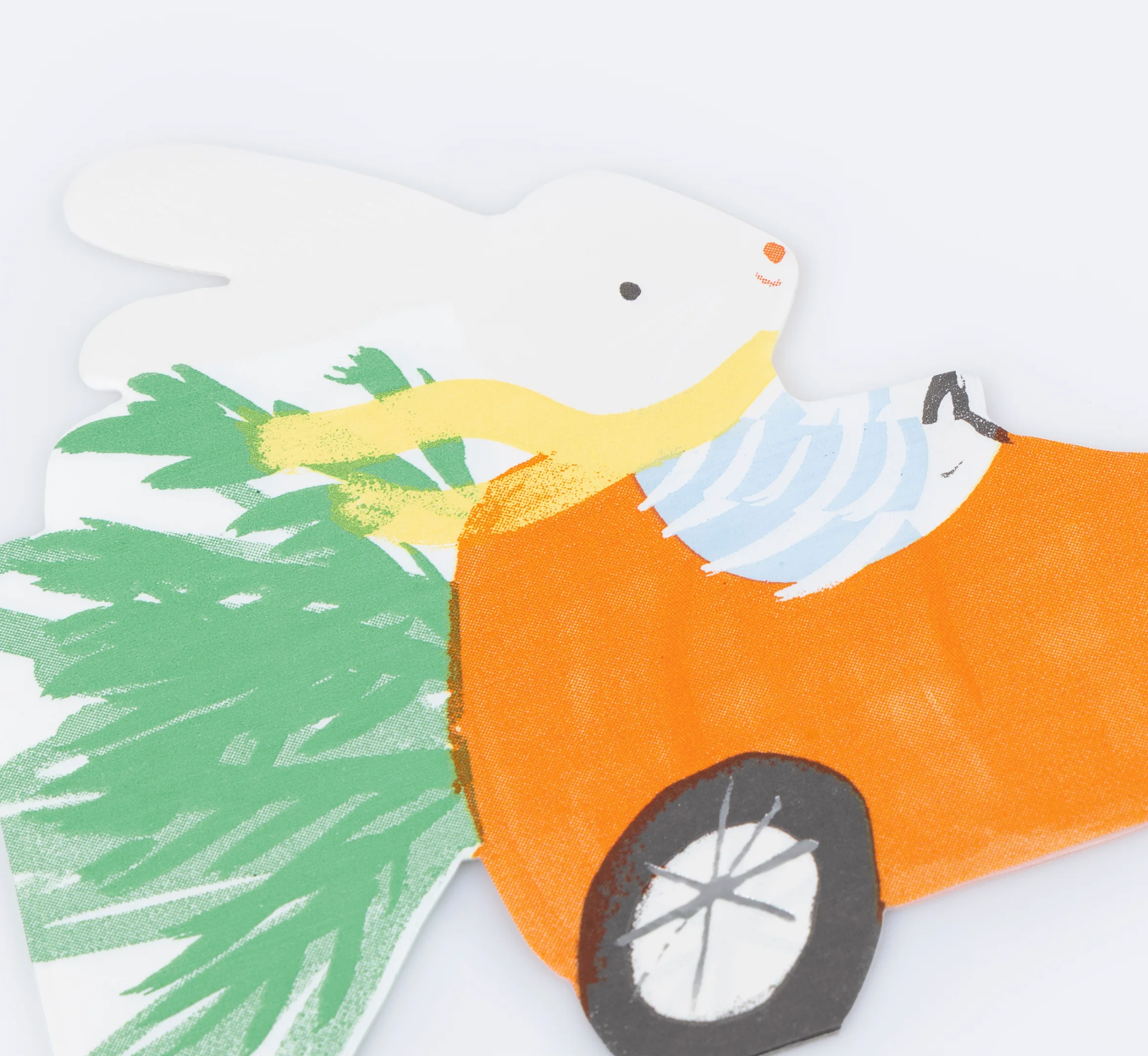 Guardanapos de folha tripla com coelho em carro cenoura, para festa ou aniversário, com medida de 20 x 14,9cm.
