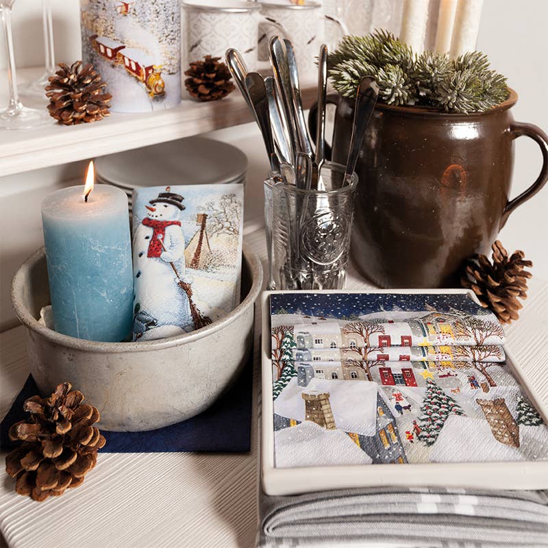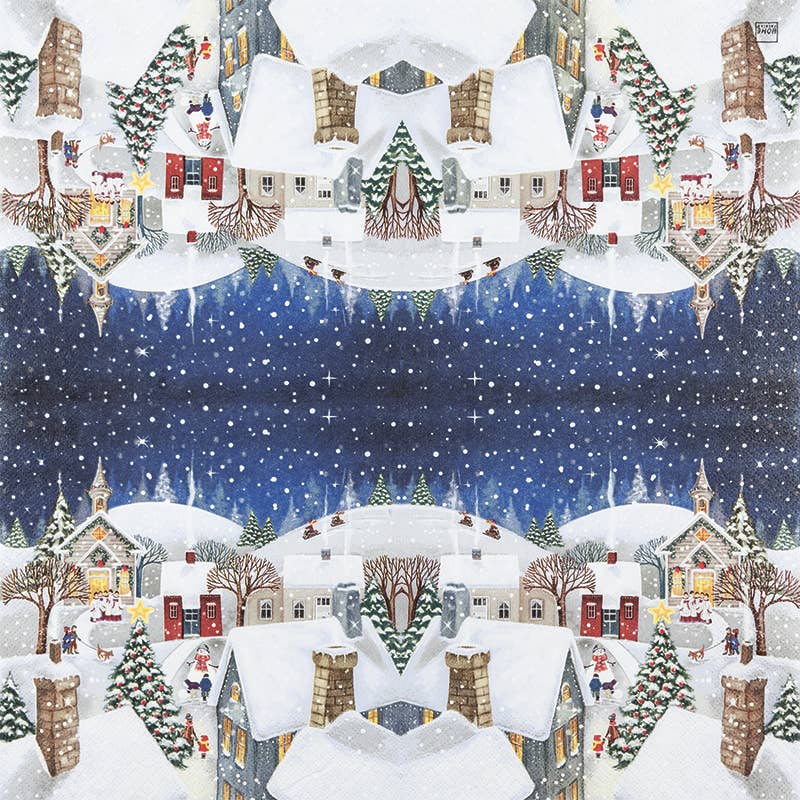 Com riqueza de detalhes e atmosfera mágica, estes guardanapos ilustram uma vila coberta de neve iluminada pelas luzes do Natal. Cada elemento transmite aconchego, tornando-os uma escolha perfeita para mesas temáticas inspiradas em aldeias de inverno.