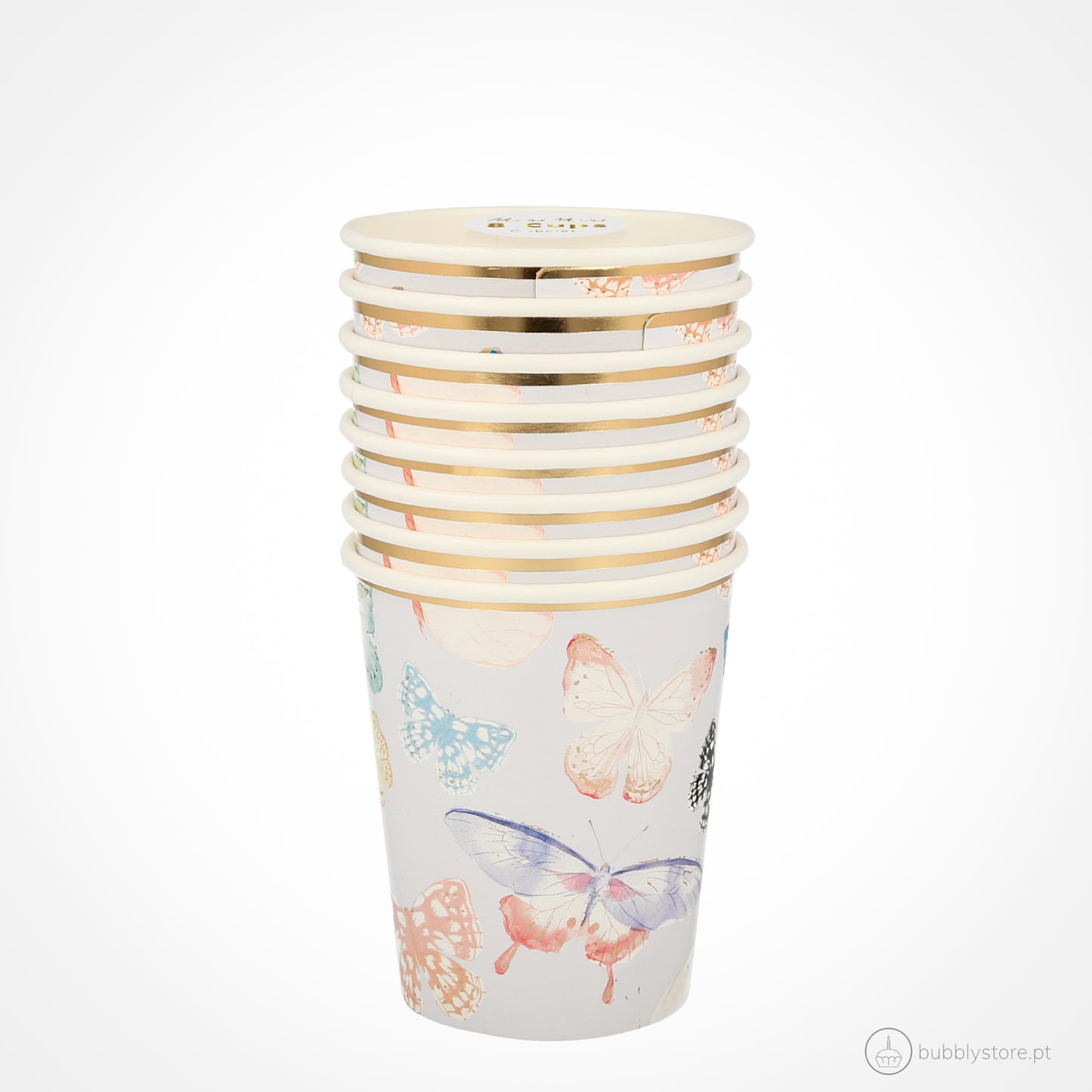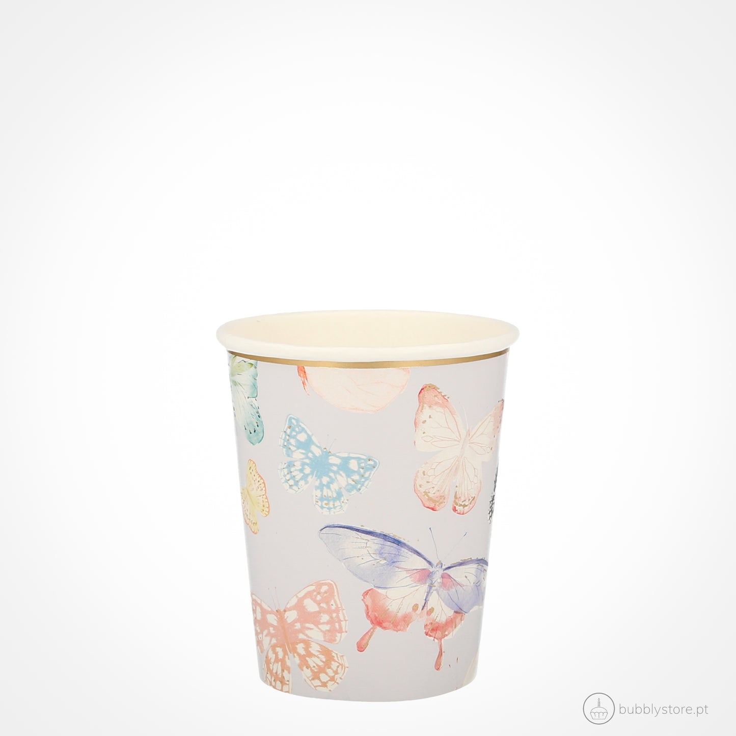 Copos de papel com estampa de borboletas, com a capacidade de 256 ml.