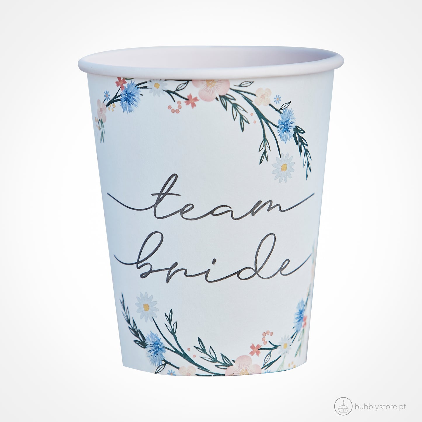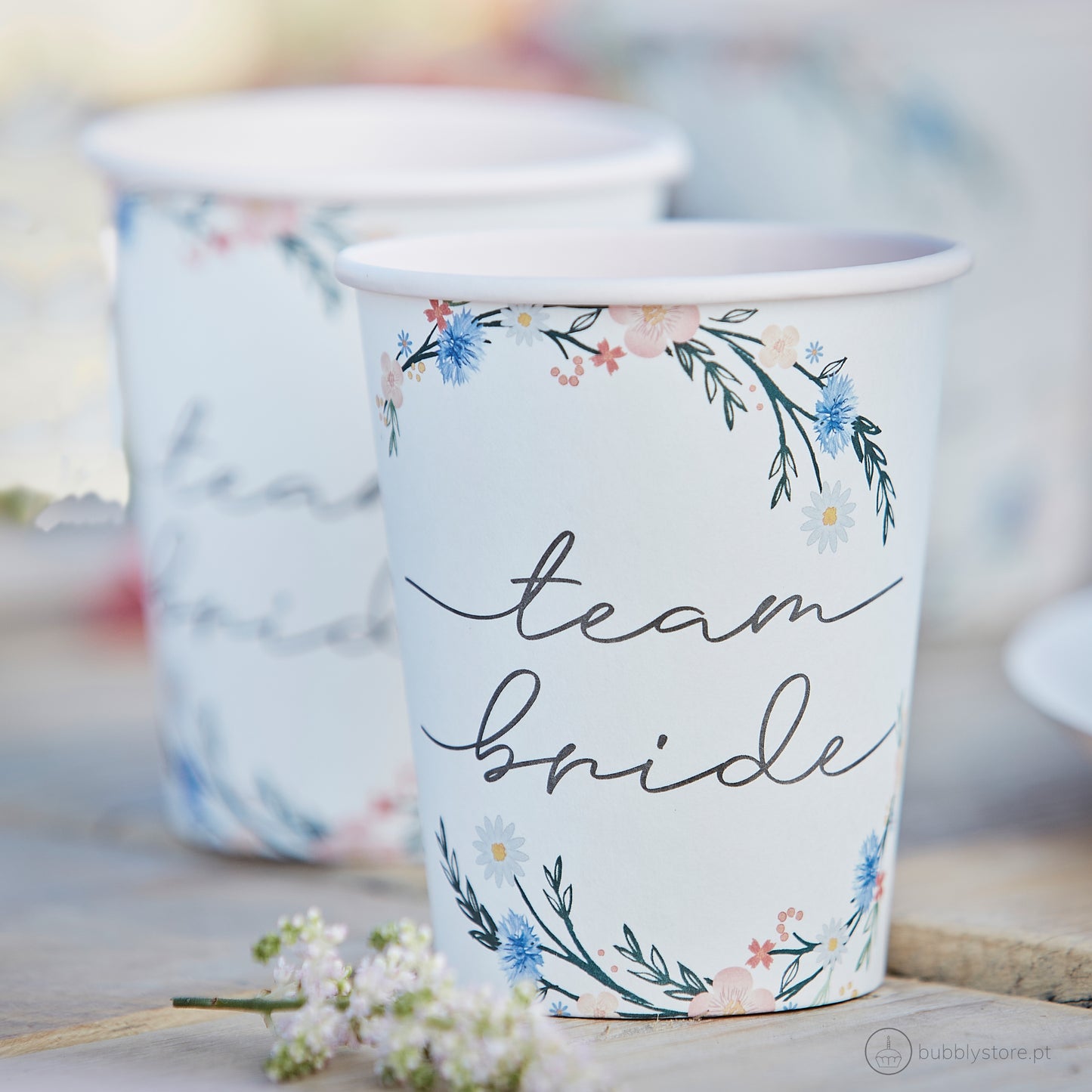 Copos florais com estampa Team Bride, com a capacidade de 260ml.