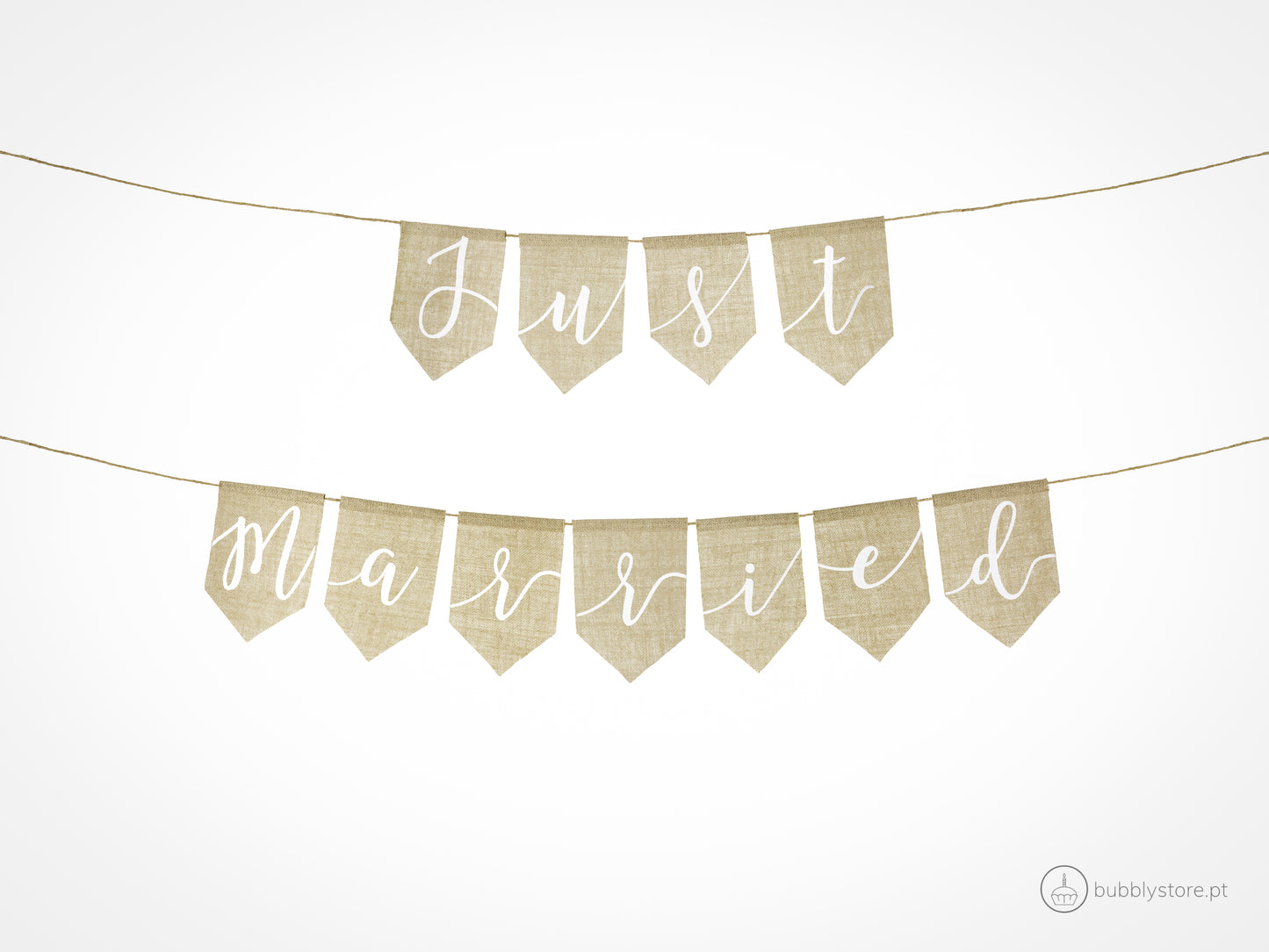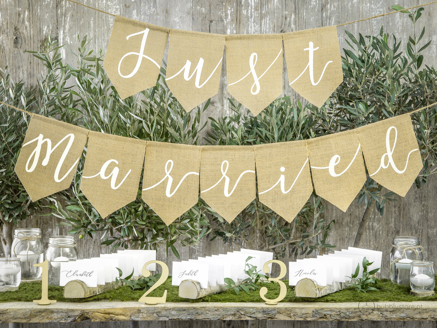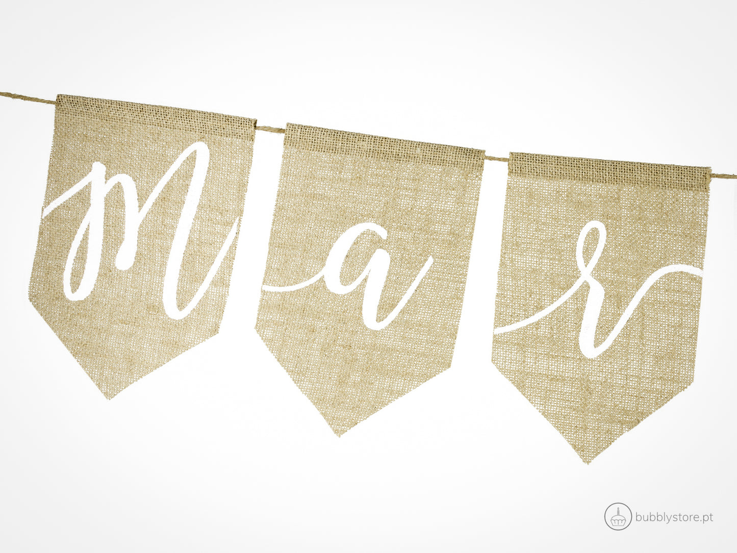 Grinalda com bandeirolas de serapilheira e letras brancas, com aproximadamente 120 cm.