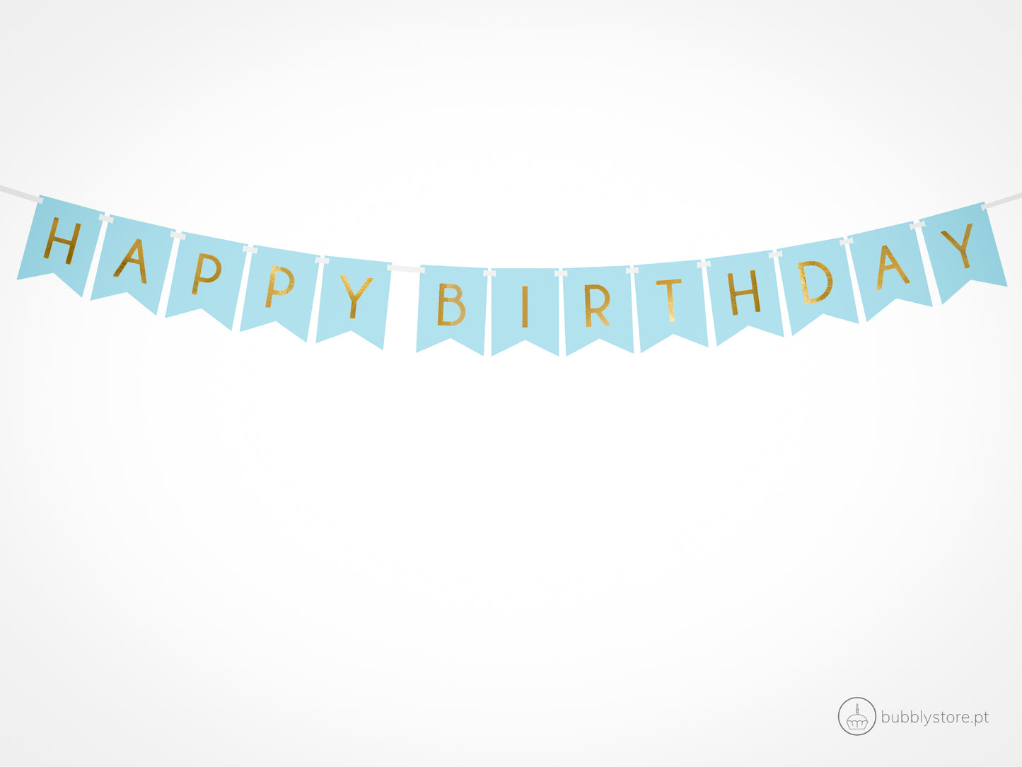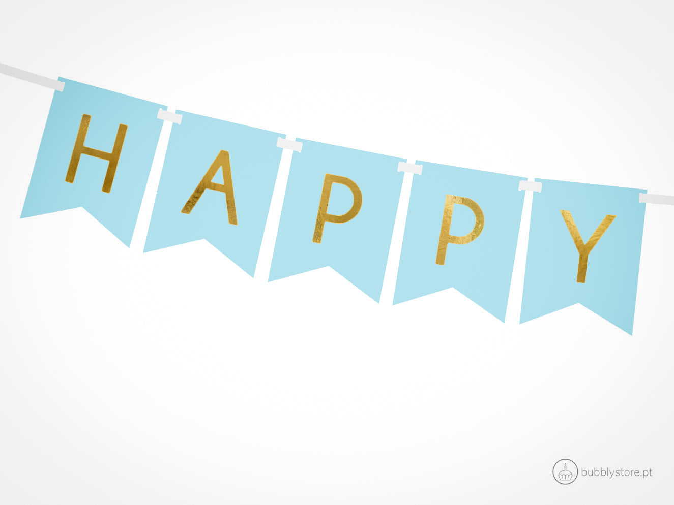 Grinalda com bandeirolas azul claro com letras douradas, com aproximadamente 2,5m.