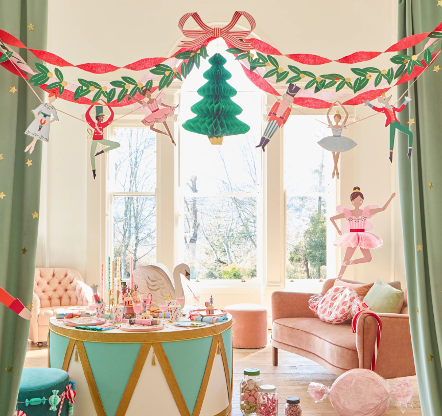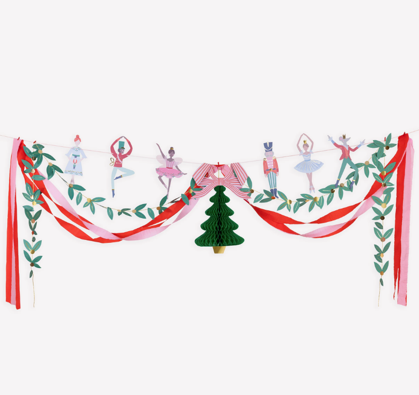 A grinalda Nutcracker Ballet transforma a decoração de Natal num cenário encantado inspirado no “Quebra-Nozes”. O conjunto de dois fios coordenados cria camadas e movimento, elevando a parede, a mesa do bolo ou a entrada da festa.