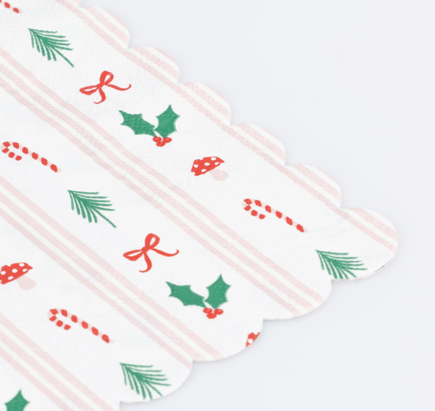 Estes guardanapos são a escolha perfeita para adicionar um toque de charme e originalidade à sua ceia de Natal. Inspirados em padrões de papel de parede nostálgicos, estes guardanapos misturam o clássico vermelho e verde com riscas cor-de-rosa, proporcionando uma estética surpreendente e fresca à sua celebração. São ideais para misturar e combinar com outros artigos da sua mesa, elevando a decoração de qualquer ocasião festiva.
