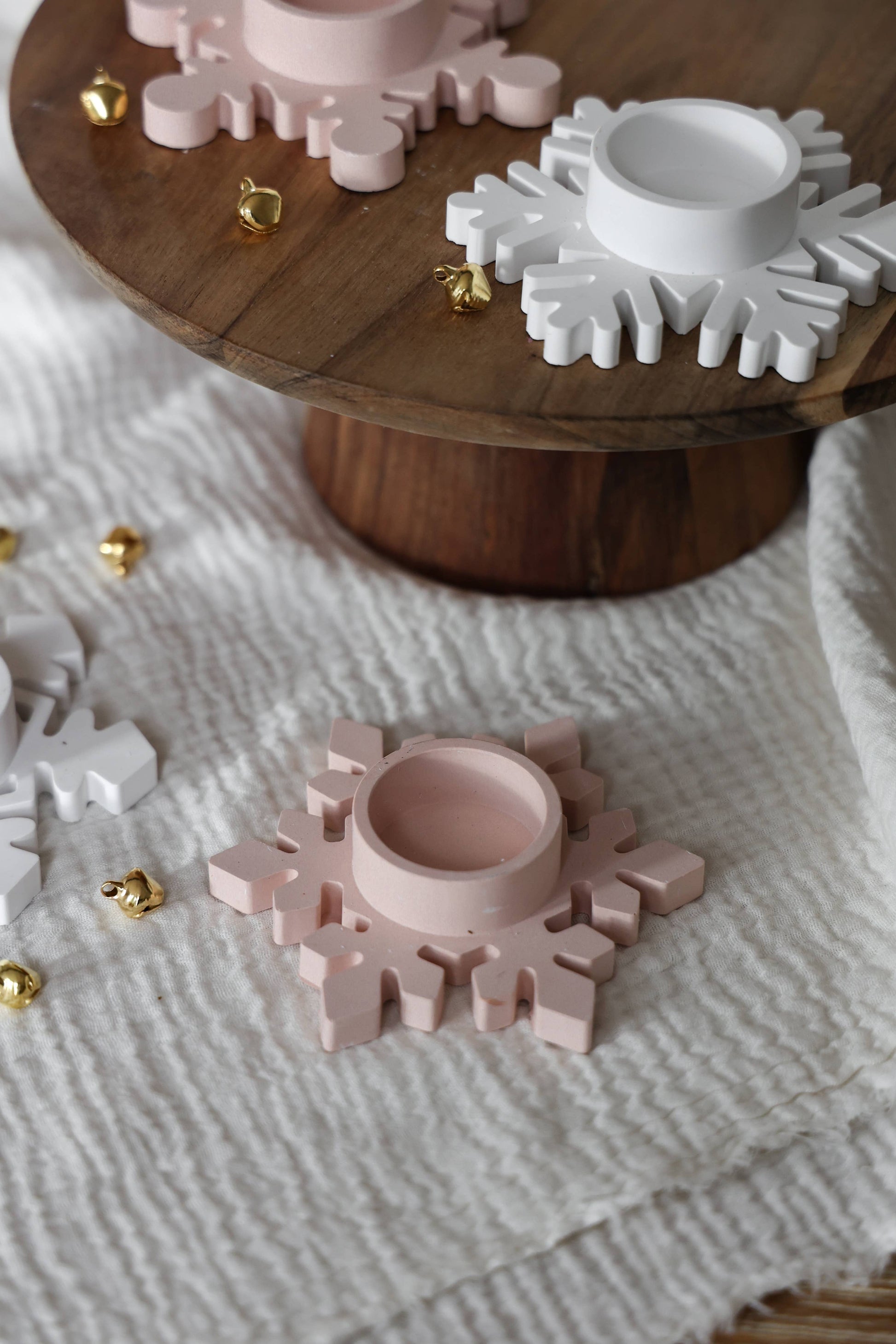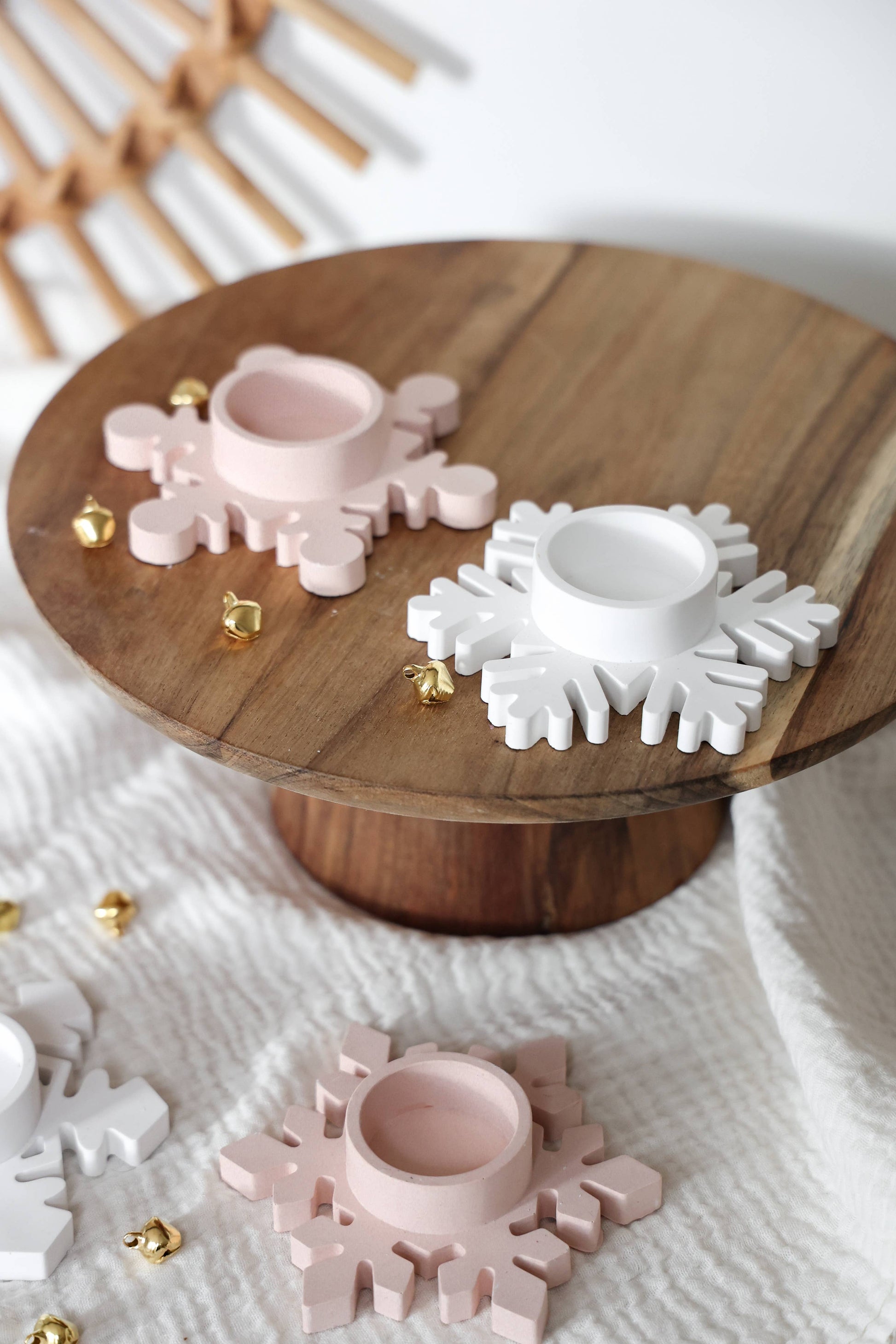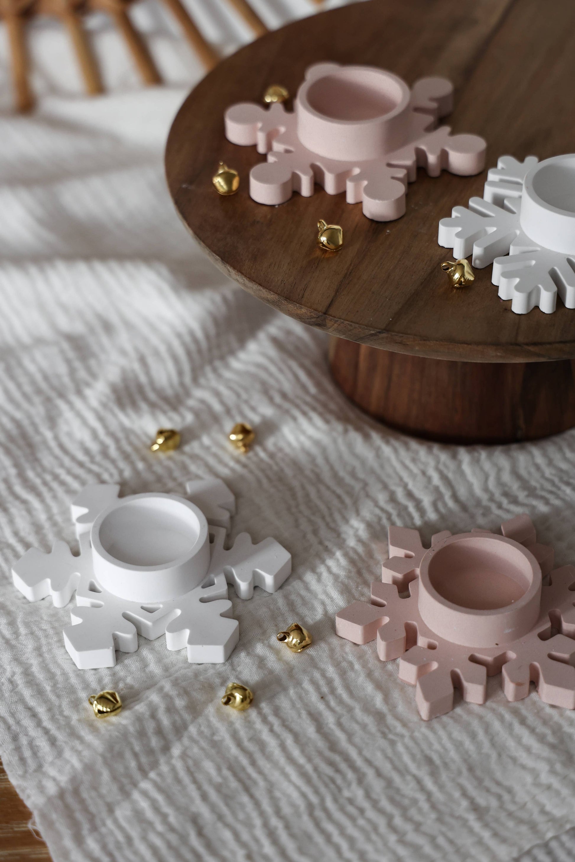 Porta-velas em forma de floco de neve, perfeito para criar uma mesa de inverno harmoniosa. Feito em cerâmica moldada, combina simplicidade com um toque decorativo delicado.