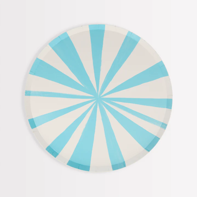 Pratos com riscas azuis e brancas, com diâmetro de 21,6cm.