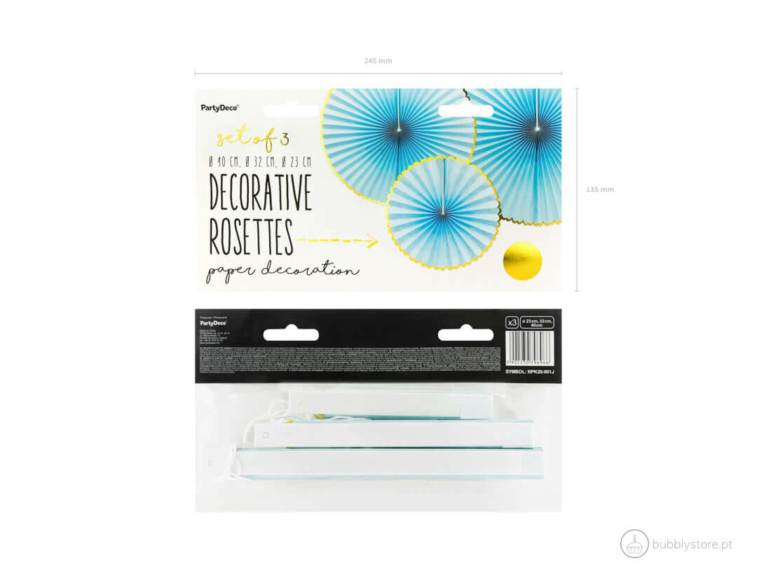 Rosetas de papel azuis com rebordo dourado, com a medida de 23, 32 e 40cm.