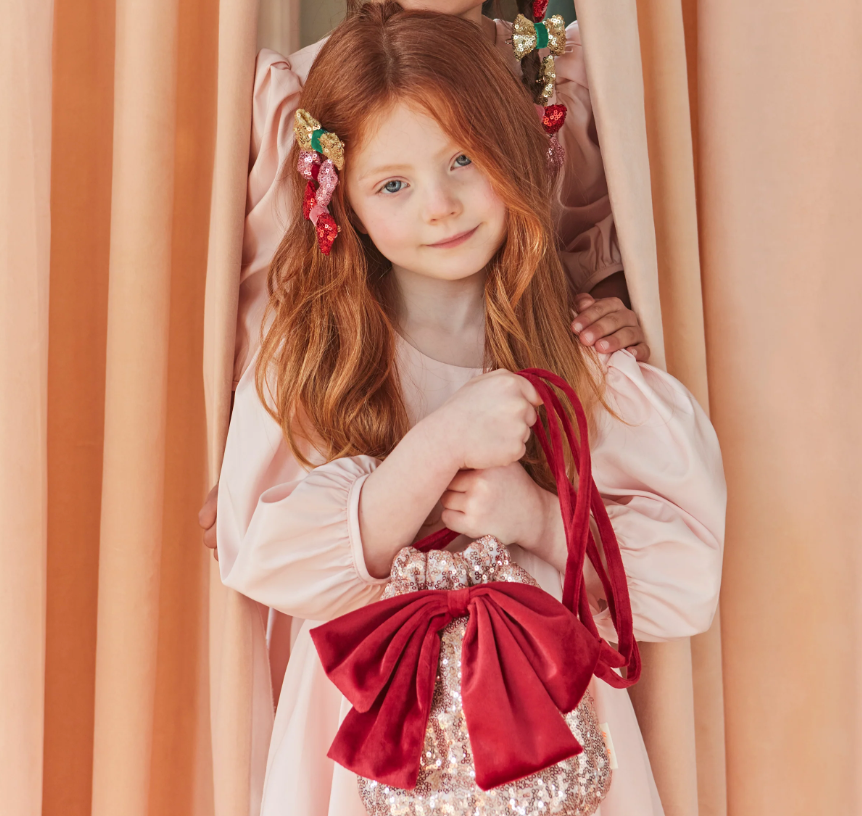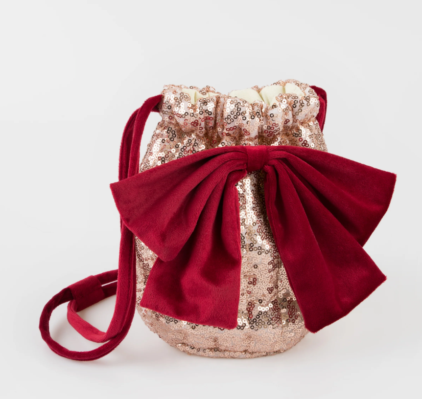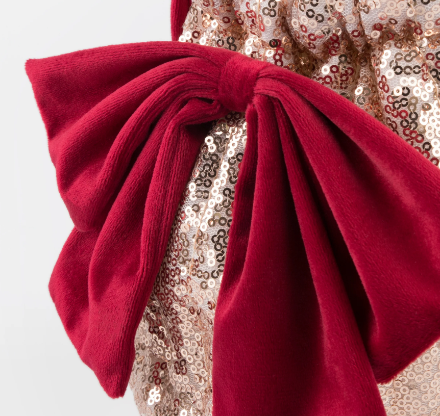 Esta bolsa é cuidadosamente trabalhada em tecido rosa com lantejoulas, conferindo-lhe uma textura cintilante e delicada. O interior possui um forro de lona natural para maior durabilidade e um acabamento elegante. O laço de veludo vermelho oferece um contraste luxuoso e um toque de cor vibrante. O cabo em cordão de veludo a condizer completa o design. As suas dimensões são de 152 x 184 x 152mm.
