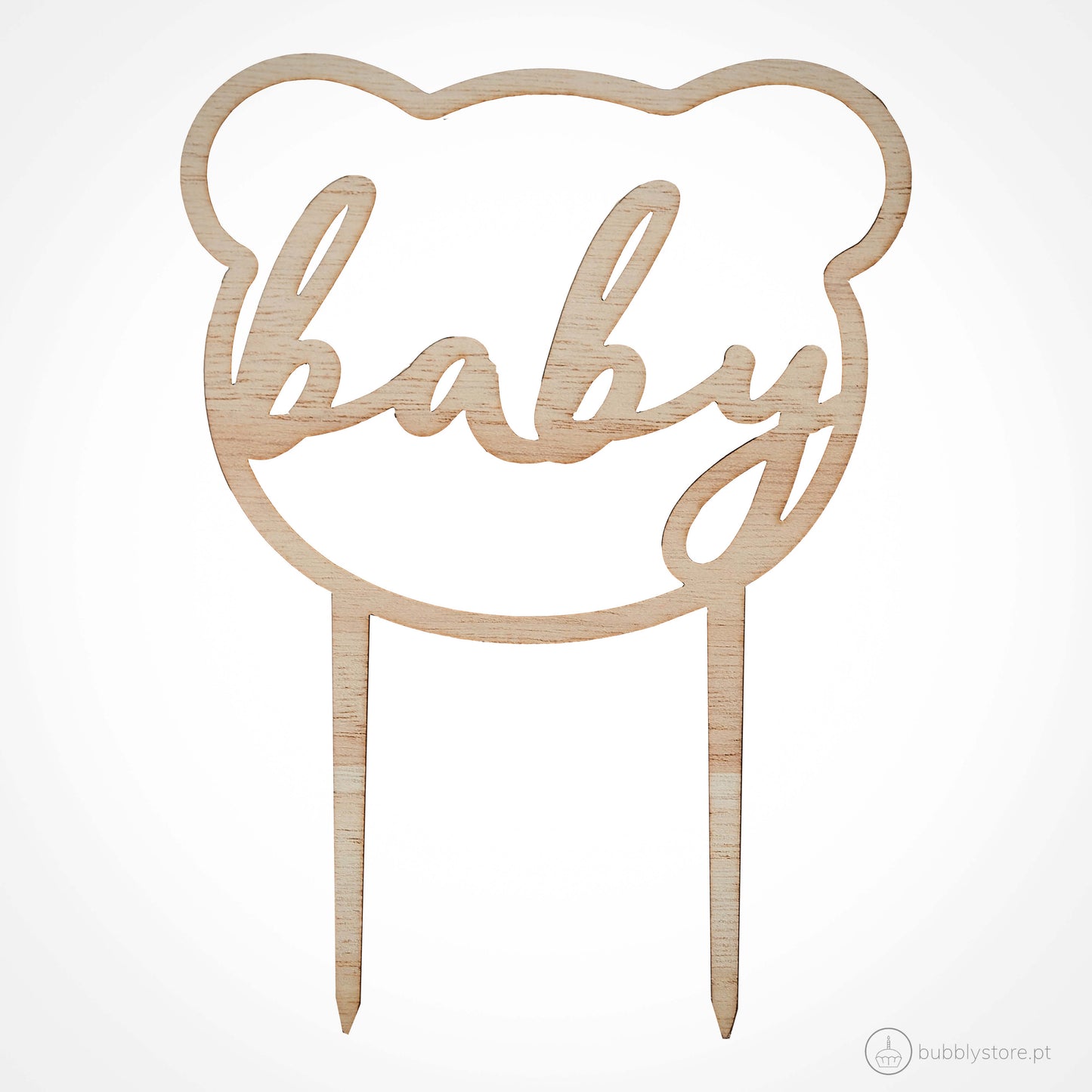Topo de bolo em forma de ursinho em madeira, com a medida de 16 x 12cm.