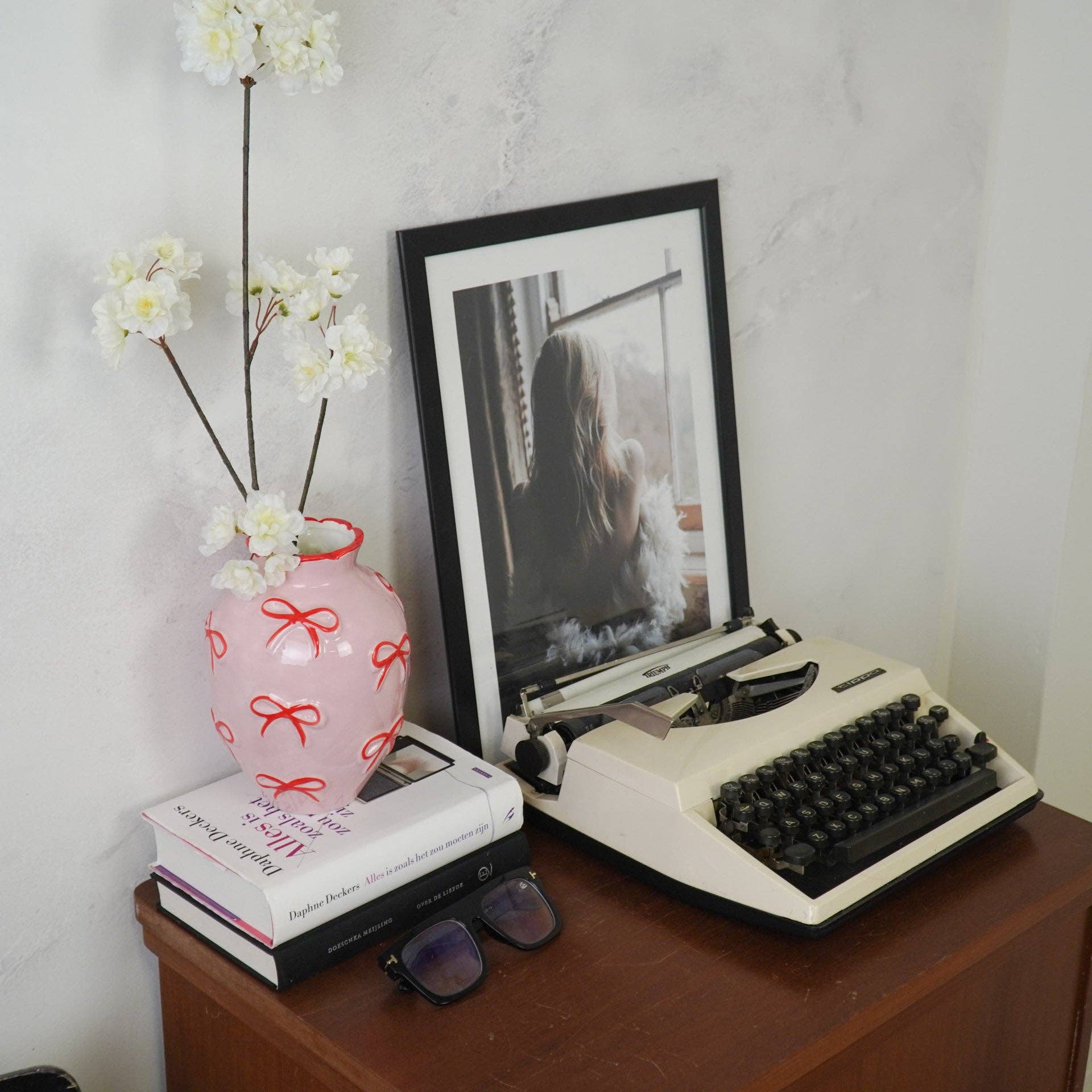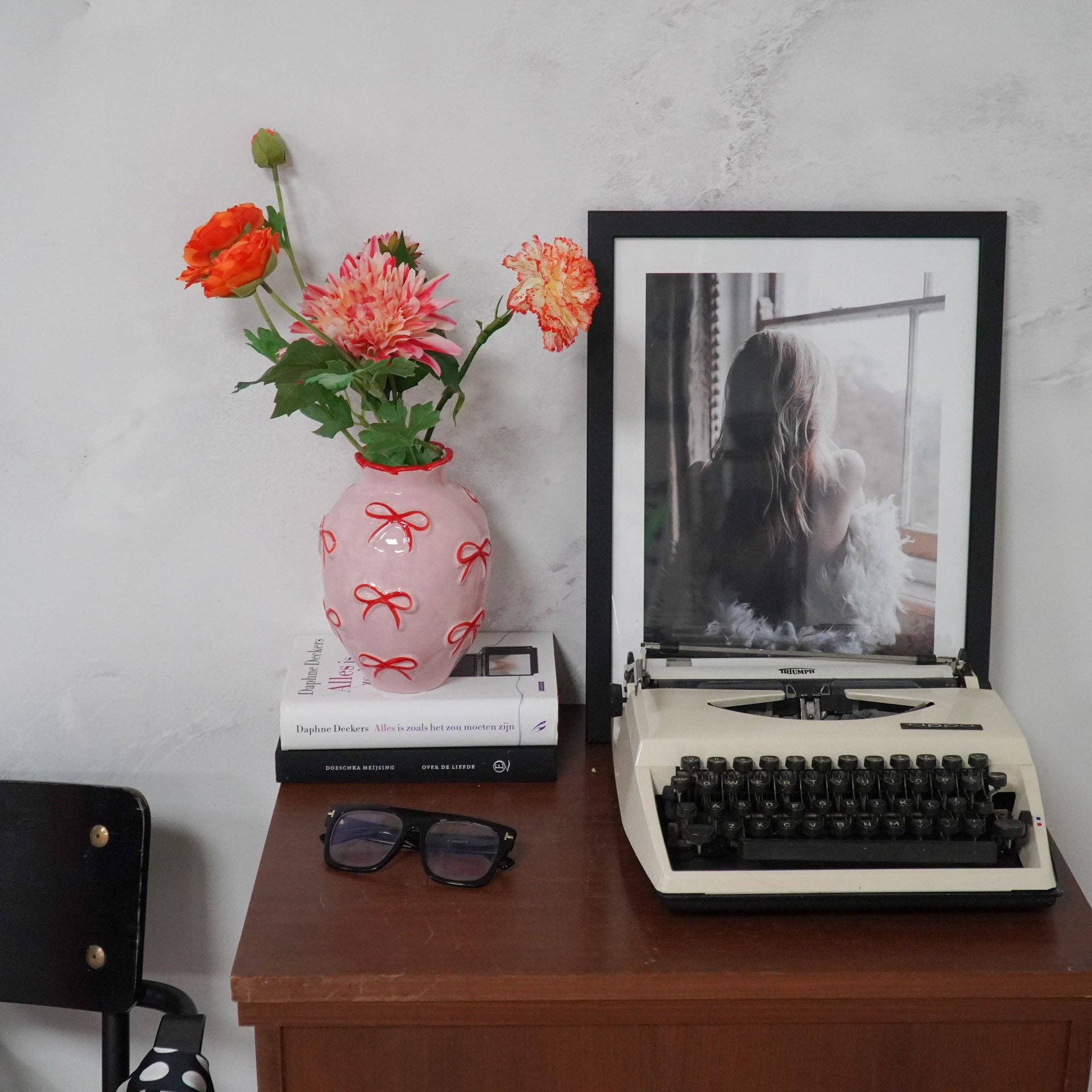 Este vaso acrescenta presença e vivacidade ao ambiente, tornando-se um destaque decorativo graças ao seu formato elegante e laços contrastantes.