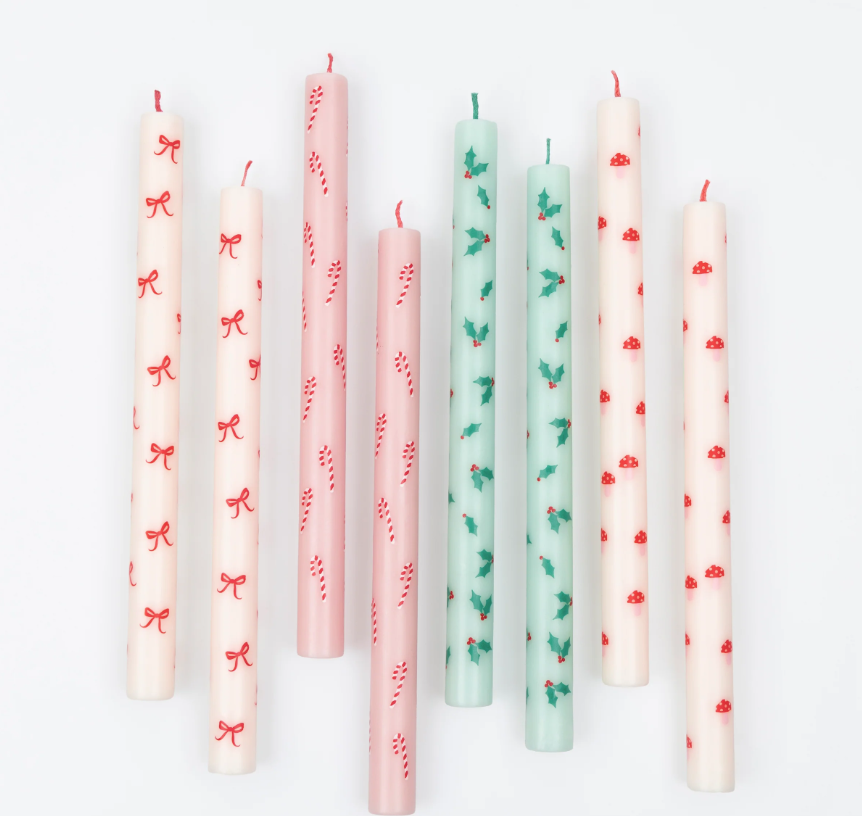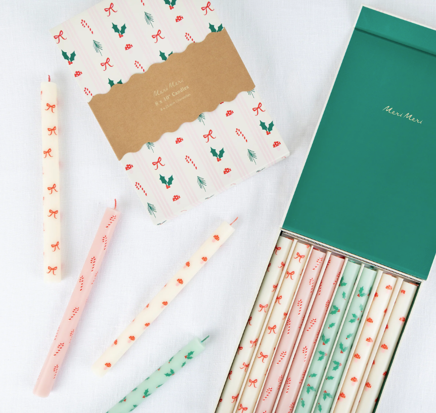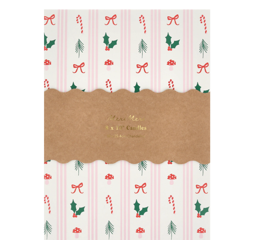 Este pack inclui oito velas, apresentadas em tons de marfim, rosa e menta, com padrões encantadores de laços vermelhos, bengalas doces às riscas, azevinho e cogumelos. Destacam-se os pavios em vermelho e verde, que acrescentam um pormenor festivo único. Cada vela tem uma altura de 254mm e oferece um tempo de queima de aproximadamente 7 horas. São inodoras e vêm elegantemente acondicionadas numa caixa de recordações com fecho magnético e os mesmos padrões das velas, que pode ser reutilizada.